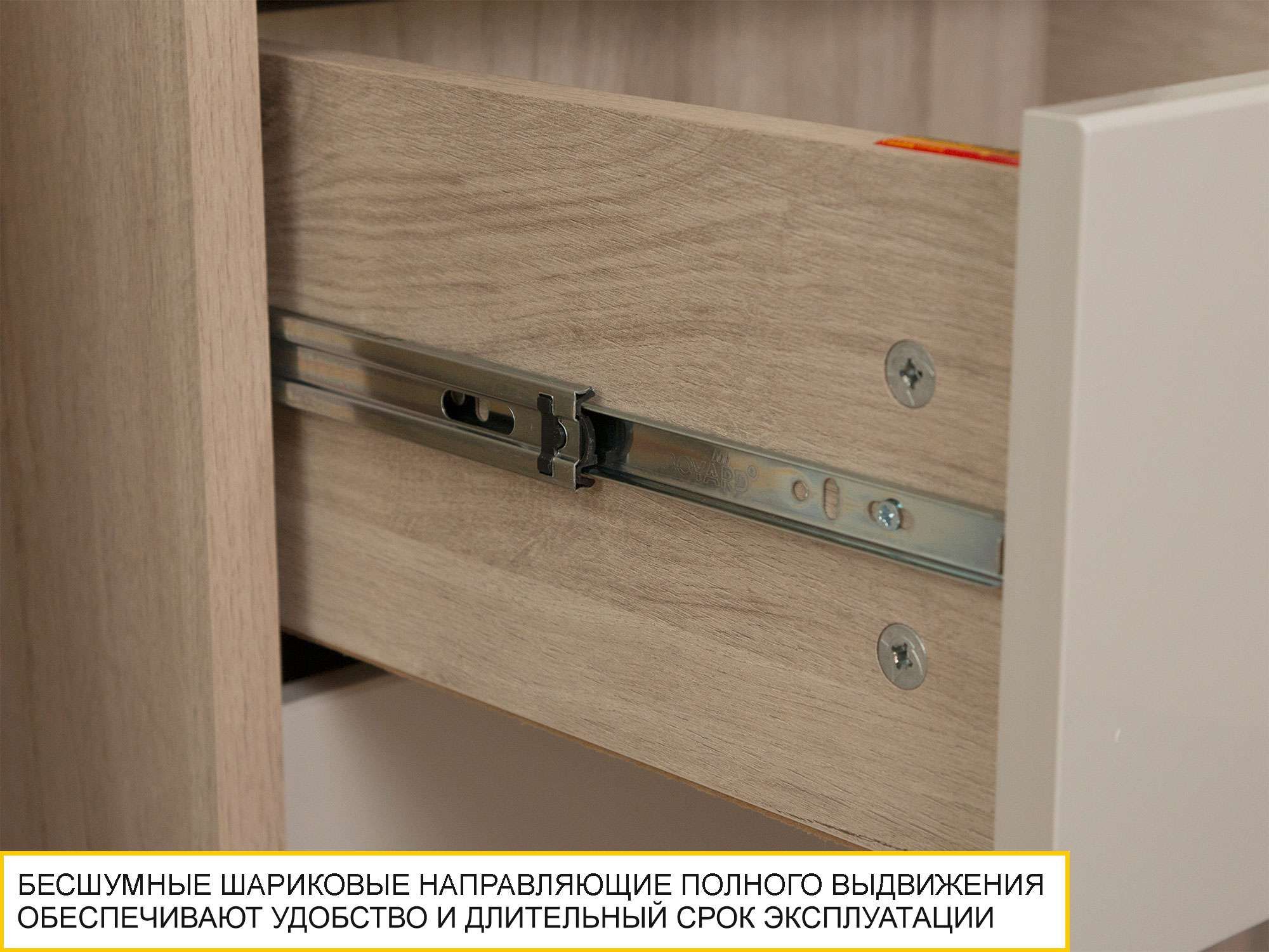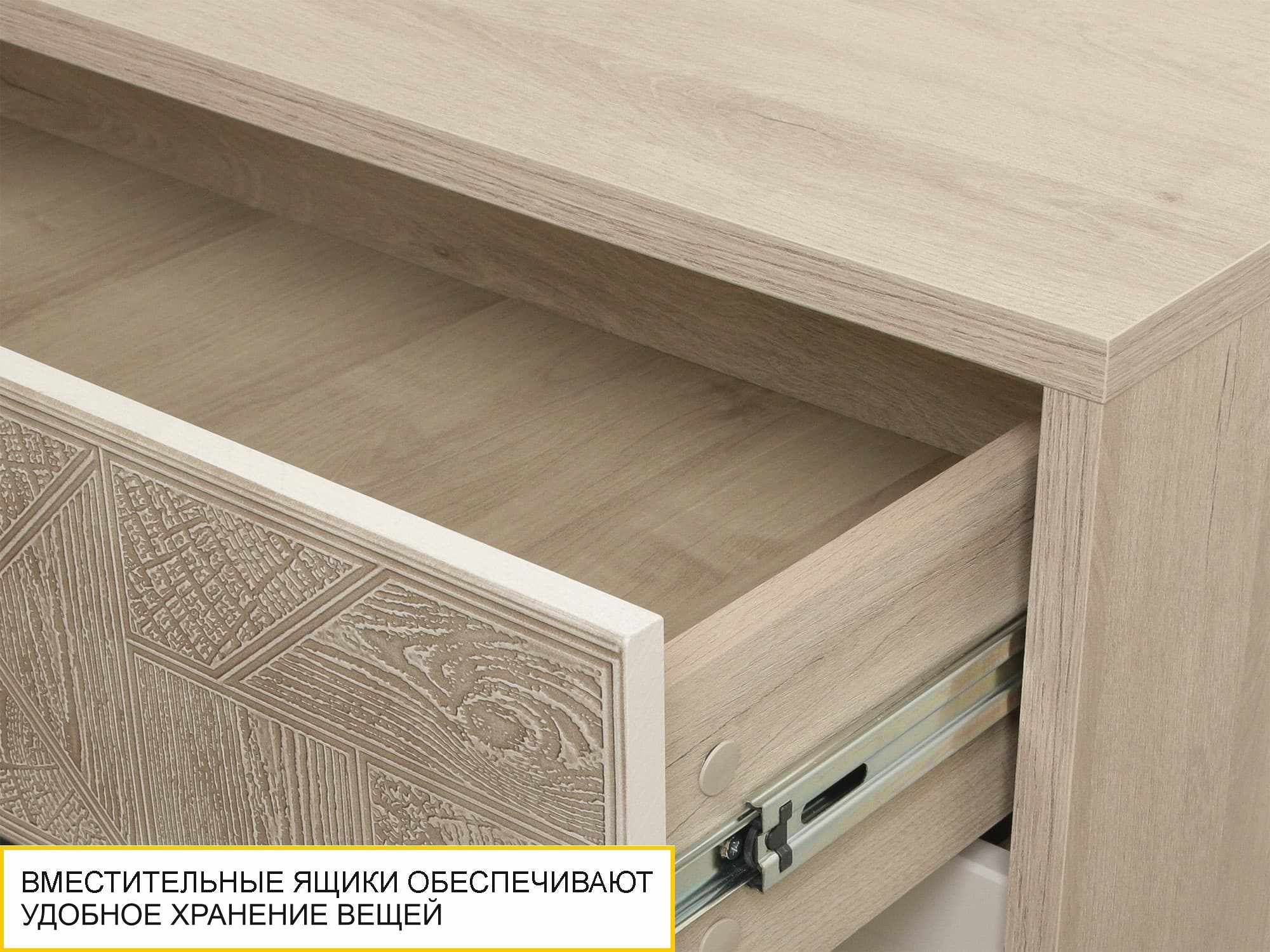 Комод «Кашемир 900.18» является частью модульной программы «Кашемир». В комоде установлены четыре выдвижных ящика. Шариковые направляющие полного выдвижения обеспечивают длительный срок эксплуатации изделия. Фасад верхнего ящика декорирован вставкой, точно передающей фактуру натурального дерева: как на ощупь, так и визуально. Ножки модуля регулируются по высоте, что позволяет при установке комода компенсировать возможные неровности пола. Рекомендуется крепление модуля к стене (крепежный уголок в комплекте).