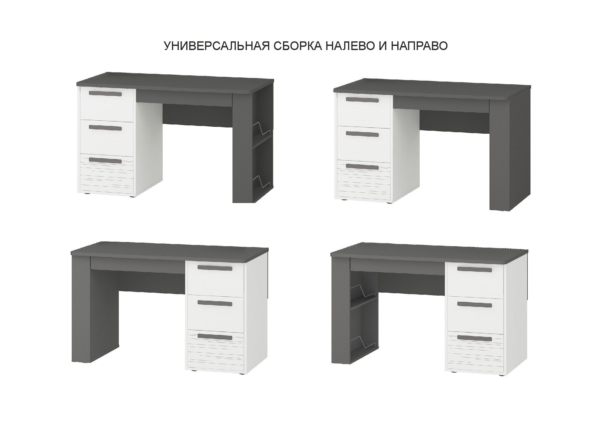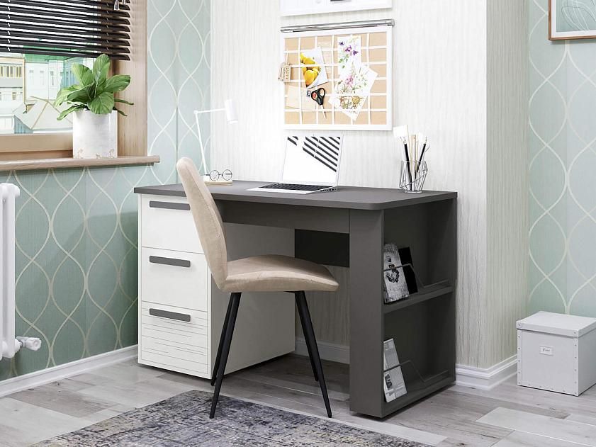 - Актуальное цветовое решение – сочетание белого с глубоким темно-серым цветом и лаконичные формы стола с легкостью впишутся в любой интерьер комнаты или рабочего кабинета.