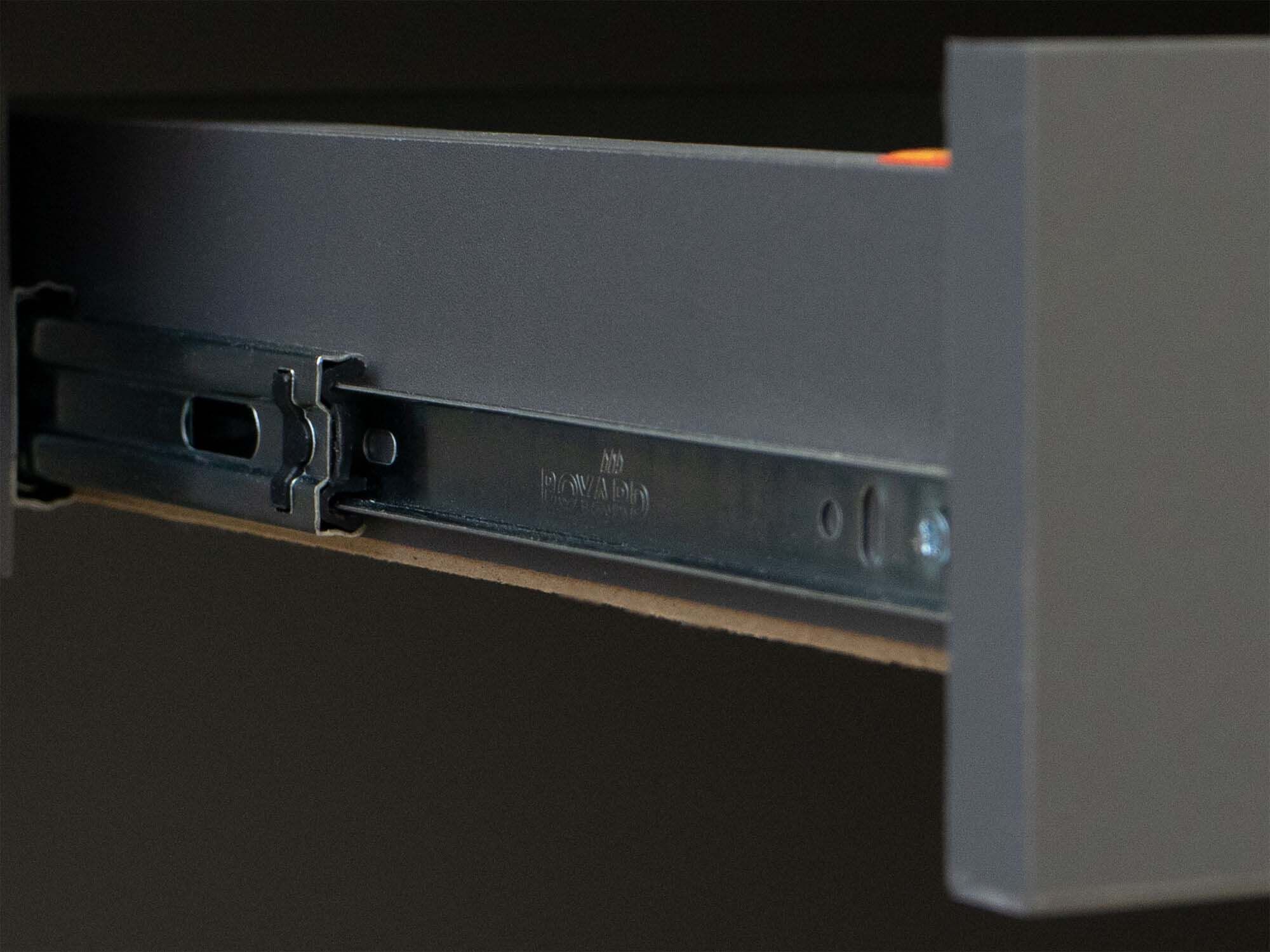 - В тумбе установлены три вместительных выдвижных ящика, которые укомплектованы полновыкатными шариковыми направляющими, которые обеспечивают комфорт и длительный срок эксплуатации изделия.