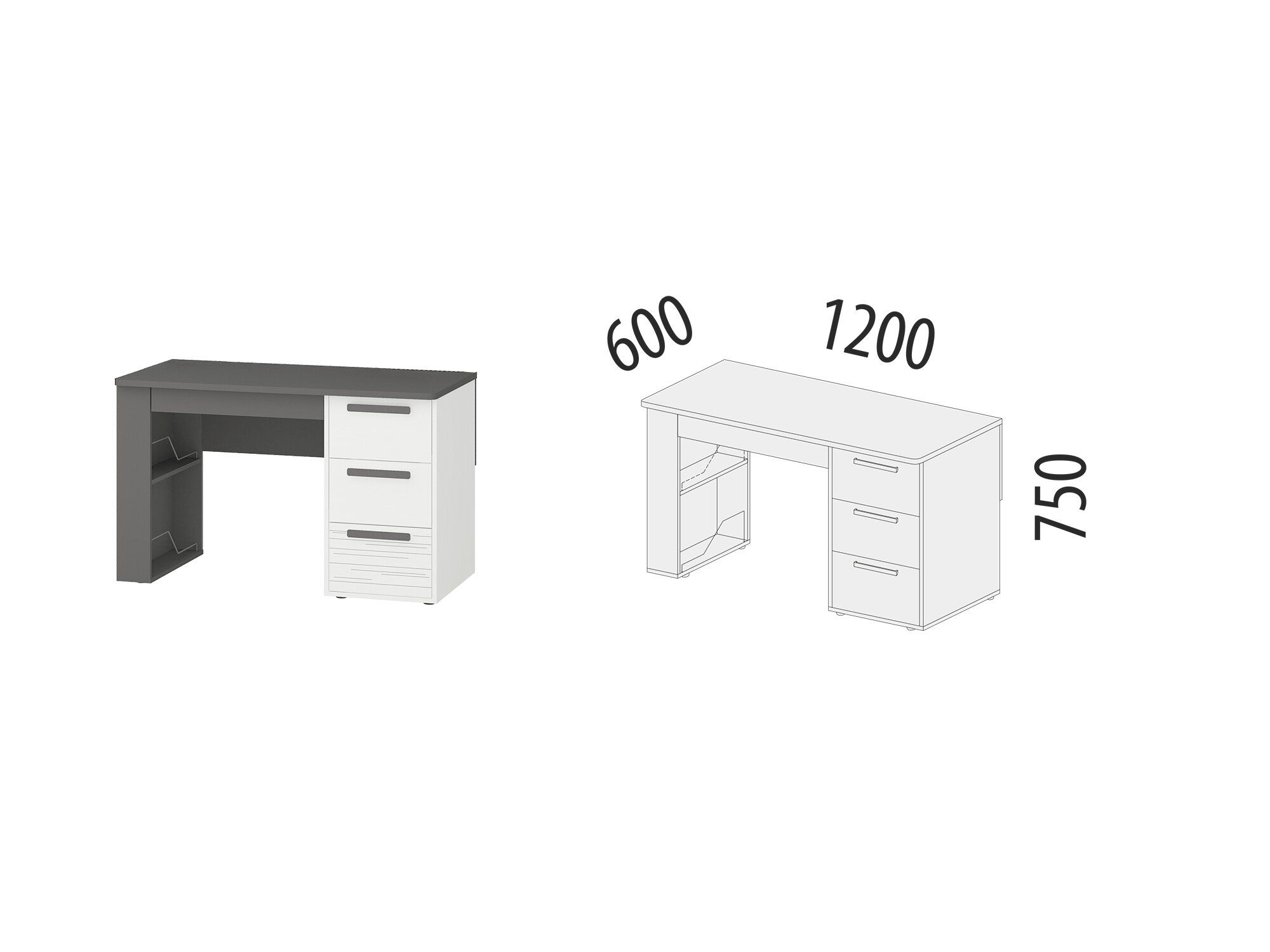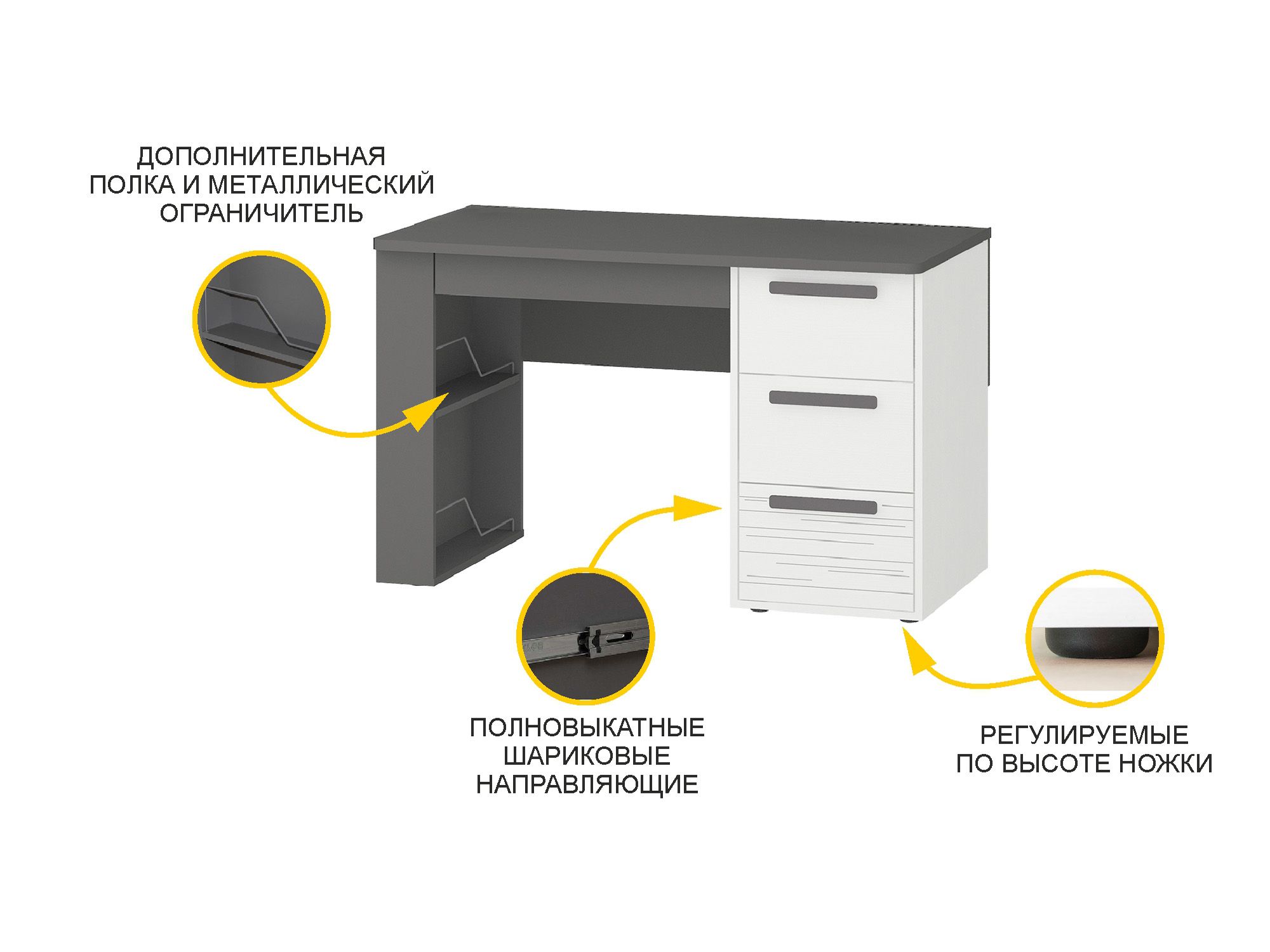 Стол рабочий «Аляска 501.15» является частью модульной программы «Аляска». Модель выполнена в современном стиле – в актуальном сочетании белого с глубоким темно-серым цветом. Корпус стола и фасады ящиков выполнены из ЛДСП повышенной прочности. Для увеличения функциональности модуля его можно комплектовать надстройкой «Аляска 501.23».