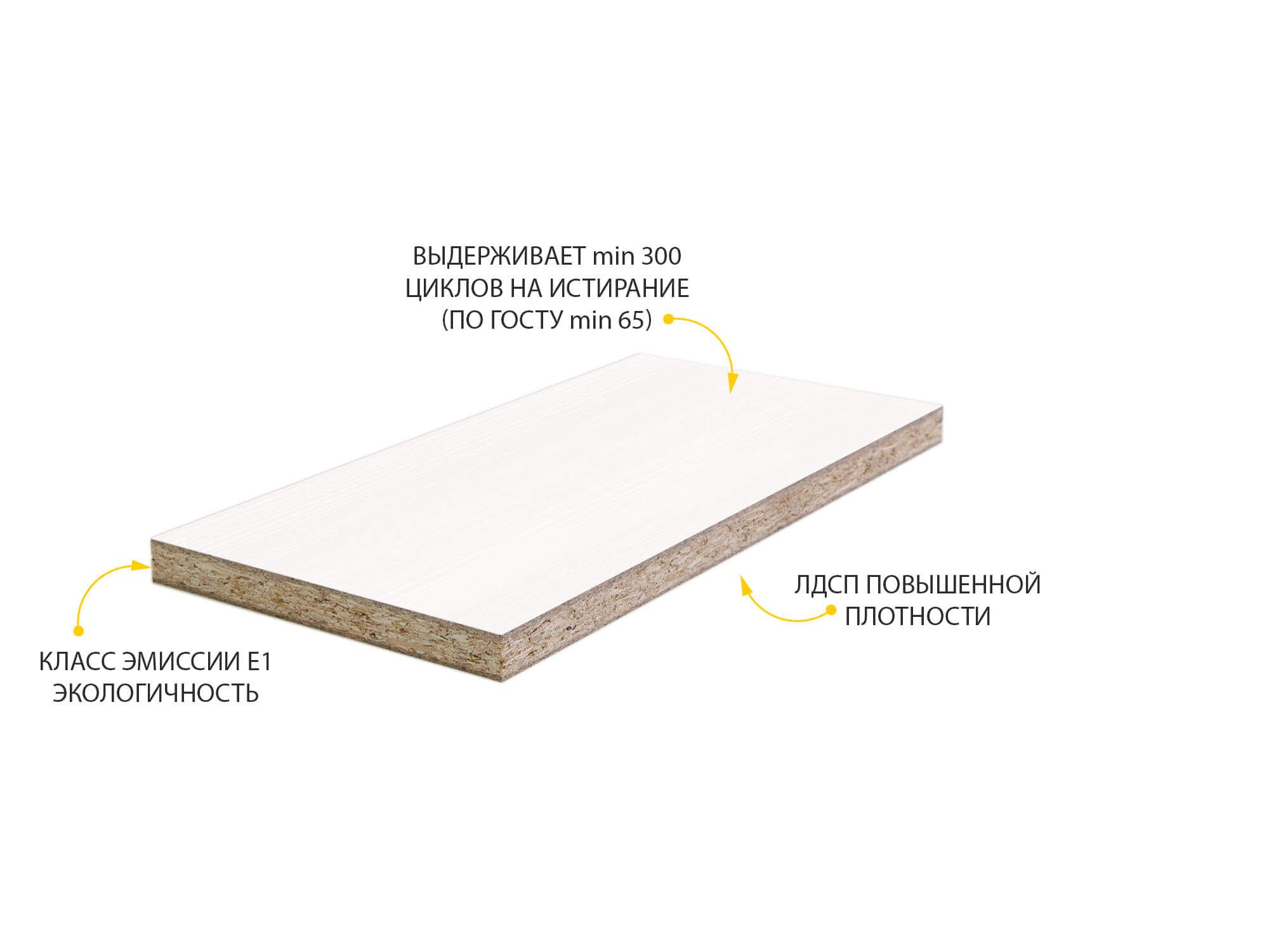 - ЛДСП выдерживает min 300 циклов на истирание, что почти в 5 раз больше, чем требуется по ГОСТу (min 65).