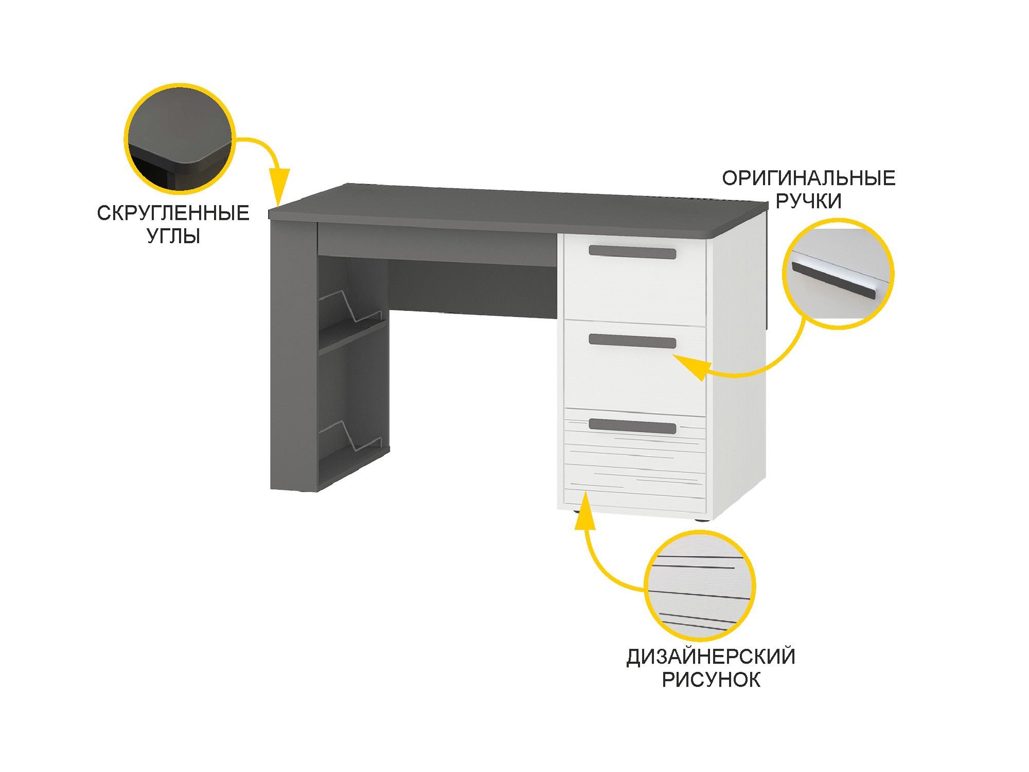 - Фасад нижнего ящика стола декорирован рисунком, нанесенным методом УФ-печати с защитным покрытием. Декор, нанесенный с помощью такой технологии, не выцветает от воздействия солнечного света и не стирается со временем.