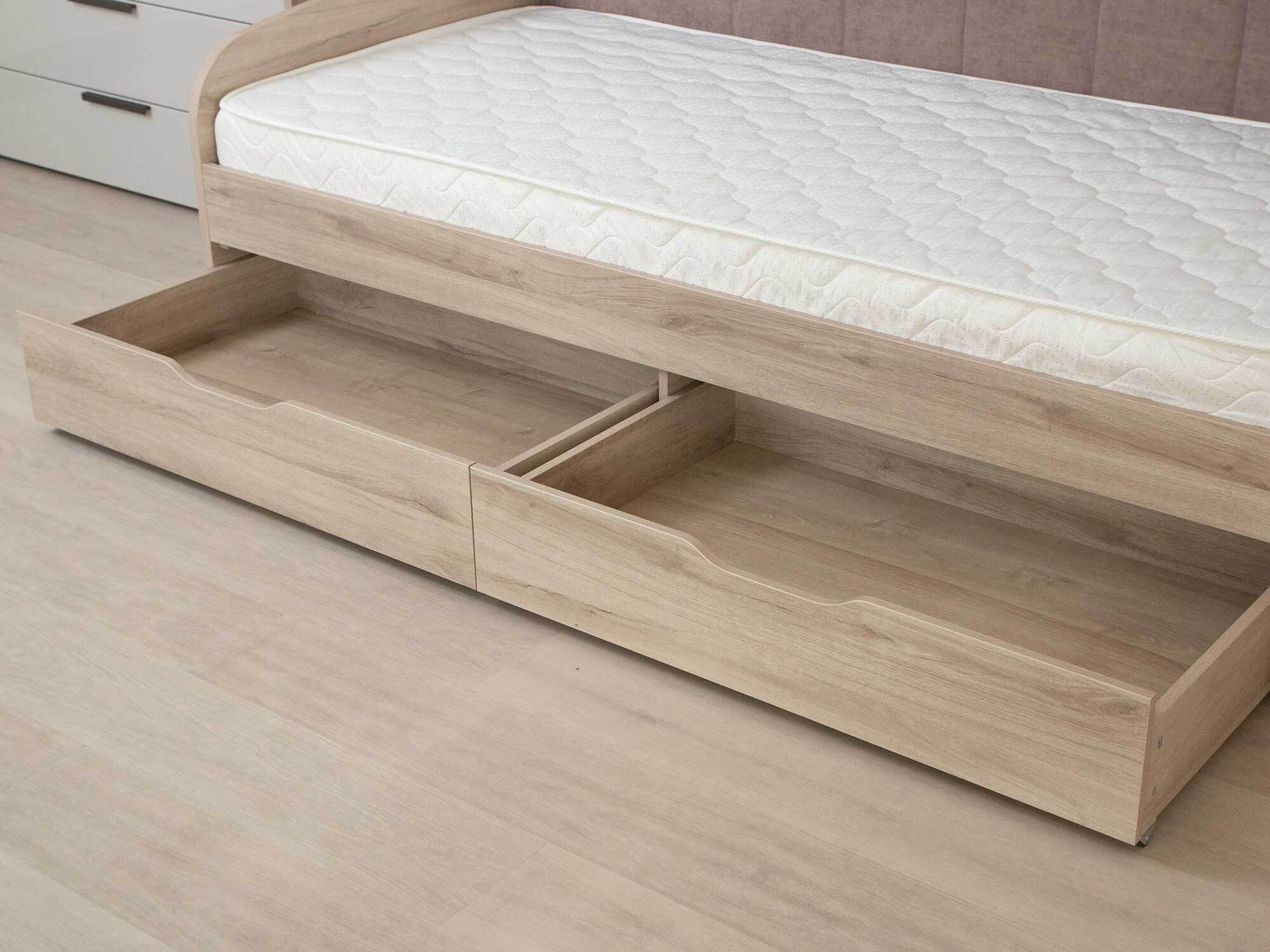 Кровать «Кашемир 900.05» оснащена двумя выдвижными ящиками. Размер спального места – 900х2000 мм. Матрас не входит в набор, Вы можете приобрести его отдельно. Статическая распределенная нагрузка на спальное место – до 500 кг.