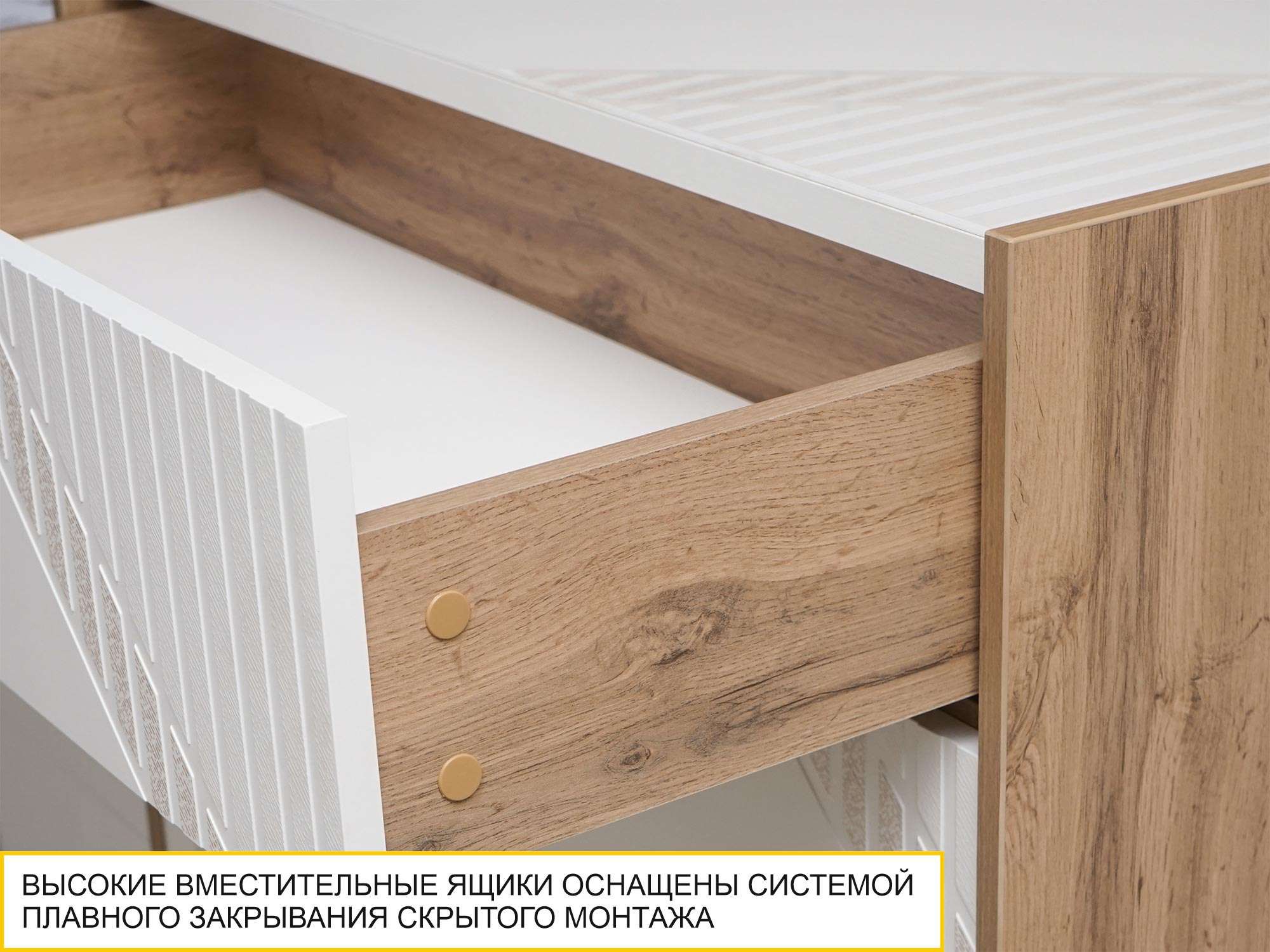 - Выдвижные ящики комода оснащены системой плавного закрывания скрытого монтажа, благодаря чему модулем приятно и удобно пользоваться.