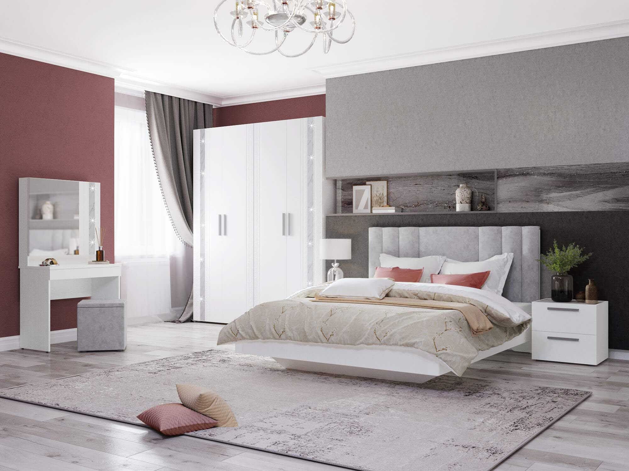 Спальня Николь – это сочетание безупречного дизайна и неповторимой атмосферы комфорта. Белоснежный цвет и матовую поверхность фасадов дополняет лаконичный 3D-рисунок и фрезеровка. Стеклянные вставки с мраморным рисунком и деликатным мерцающим блеском привлекают внимание и подчеркивают уникальность коллекции. Изголовье кровати, выполненное из софт-велюра нежно-серого цвета, подарит интерьеру Вашей спальни ощущение гармонии и спокойствия.