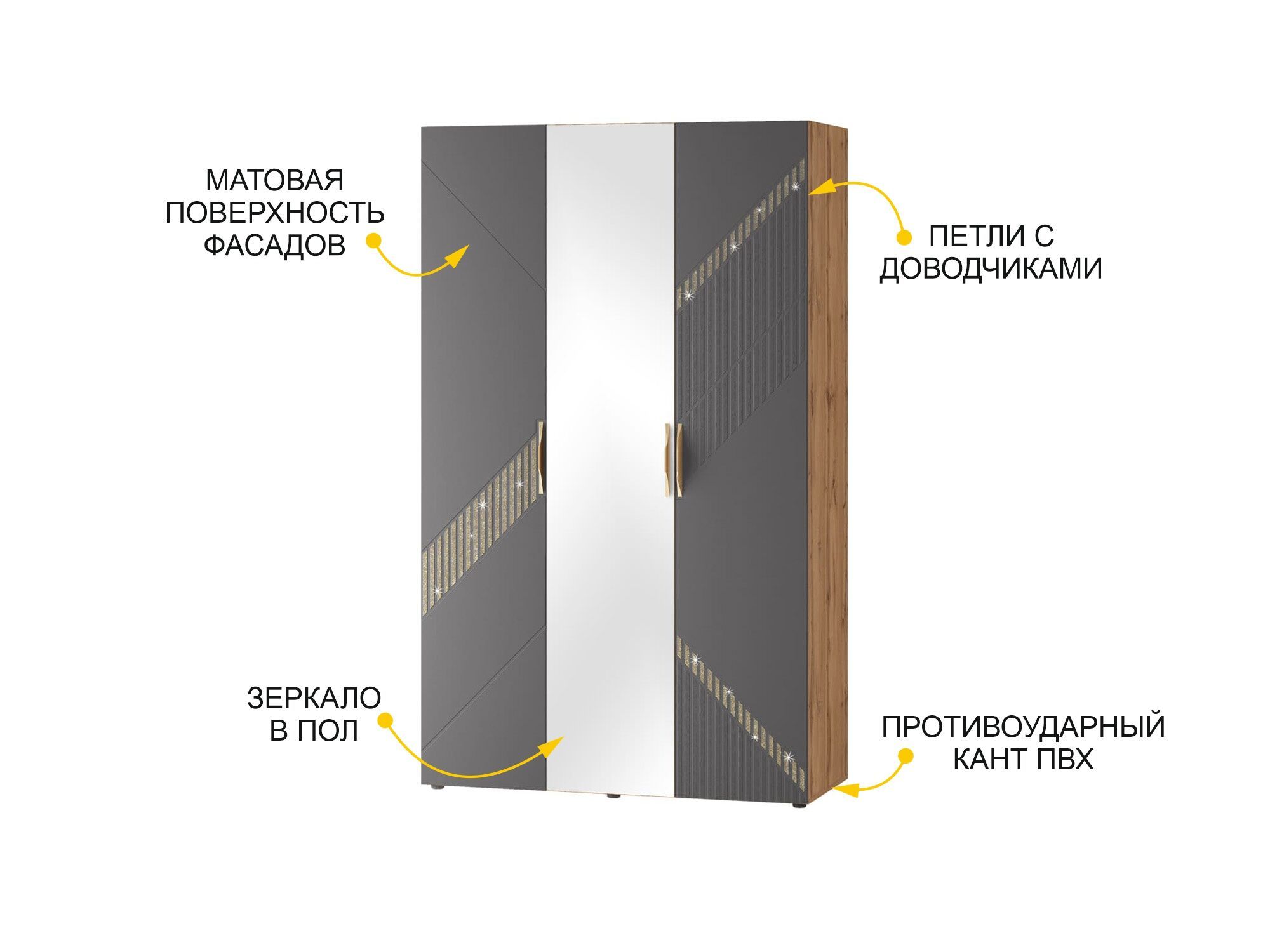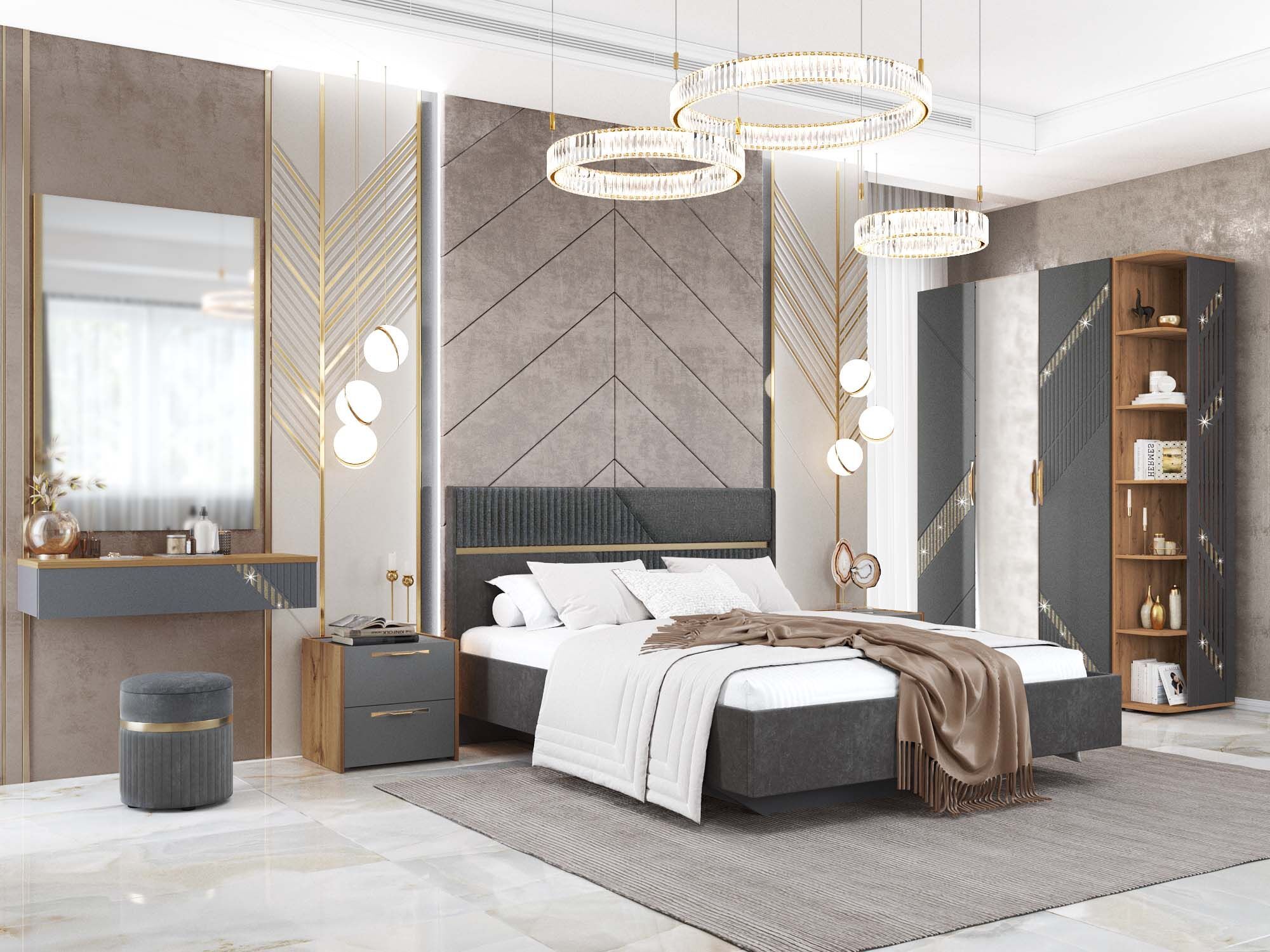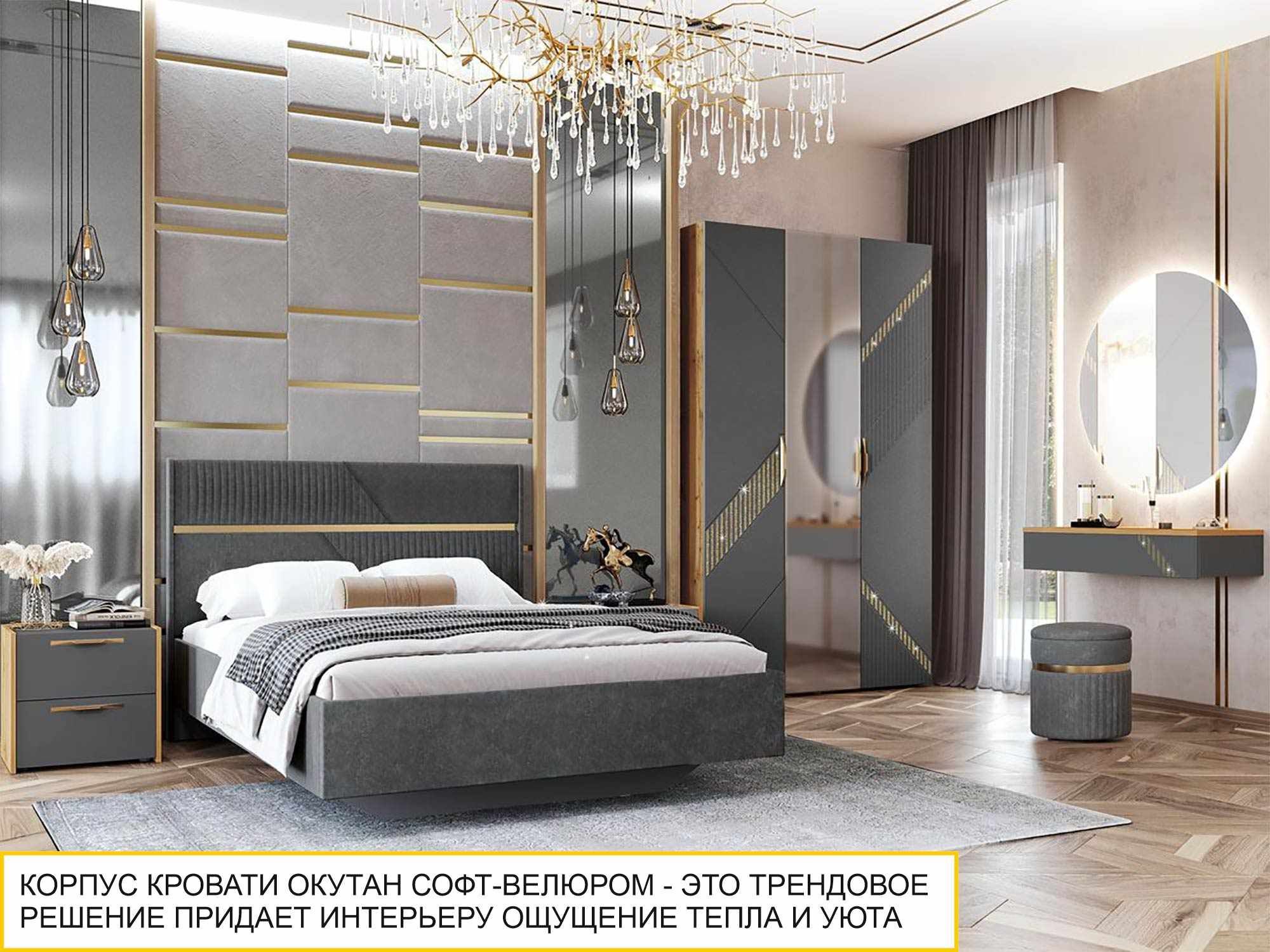 Спальный гарнитур «Монако 902 118» - это образец элегантного стиля и утонченного вкуса. Сочетание матовой графитовой поверхности фасадов с благородной древесной текстурой создает особую атмосферу гармонии и комфорта.