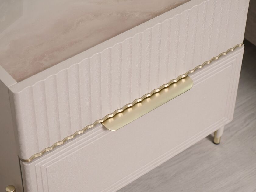 - Стеклянный топ тумбы декорирован дизайнерским рисунком «Мрамор». Легкое мерцание глиттера придает поверхности глубину и добавляет в интерьер нотку роскоши.