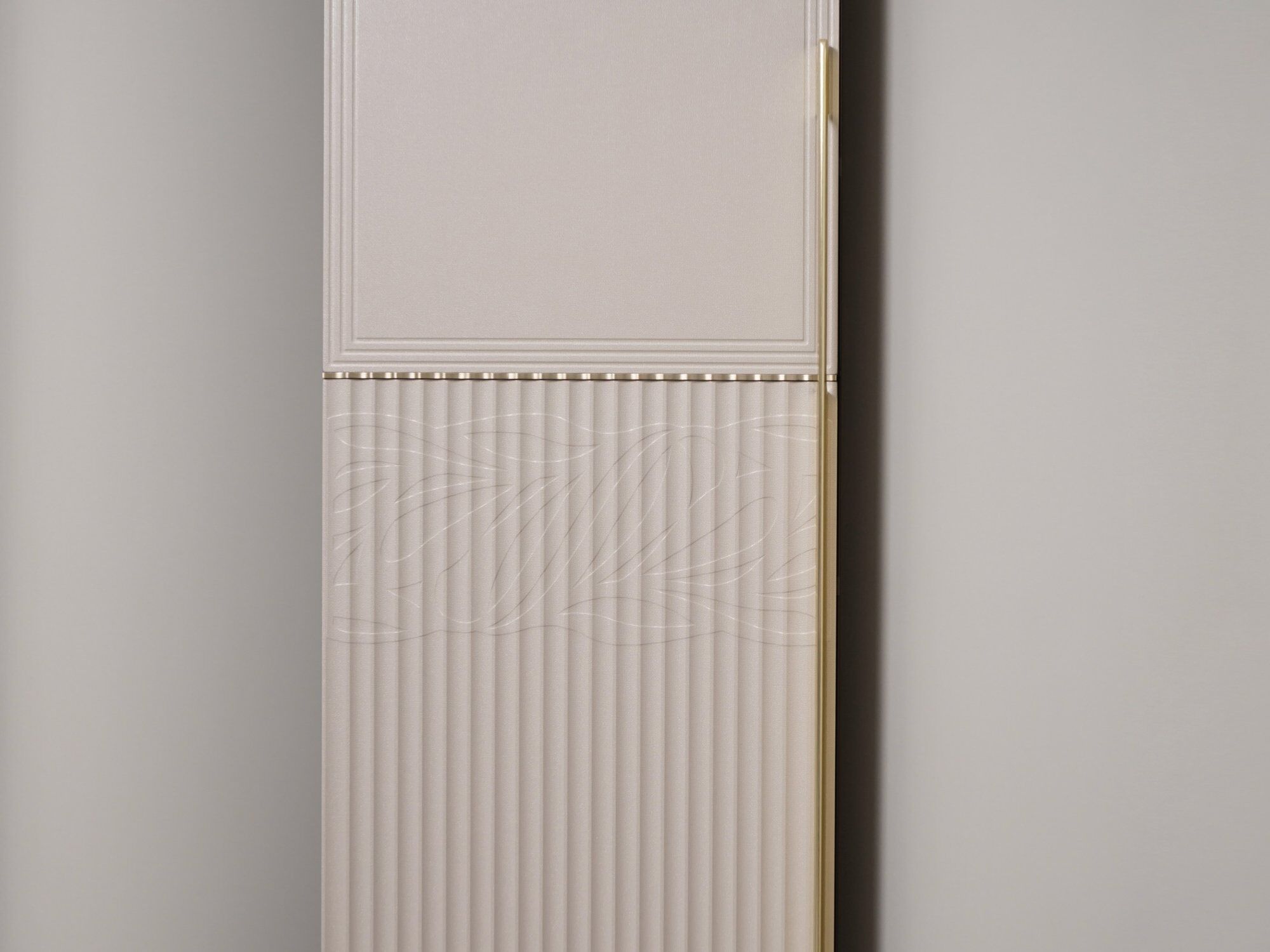 - Металлическая пластина на фасаде толщиной 5 мм проходит обработку по собственной технологии покрытия, которая придает ей изысканный оттенок «сатинового золота». Она гармонично сочетается с цветом фурнитуры и повторяет геометрию вертикальных реек.