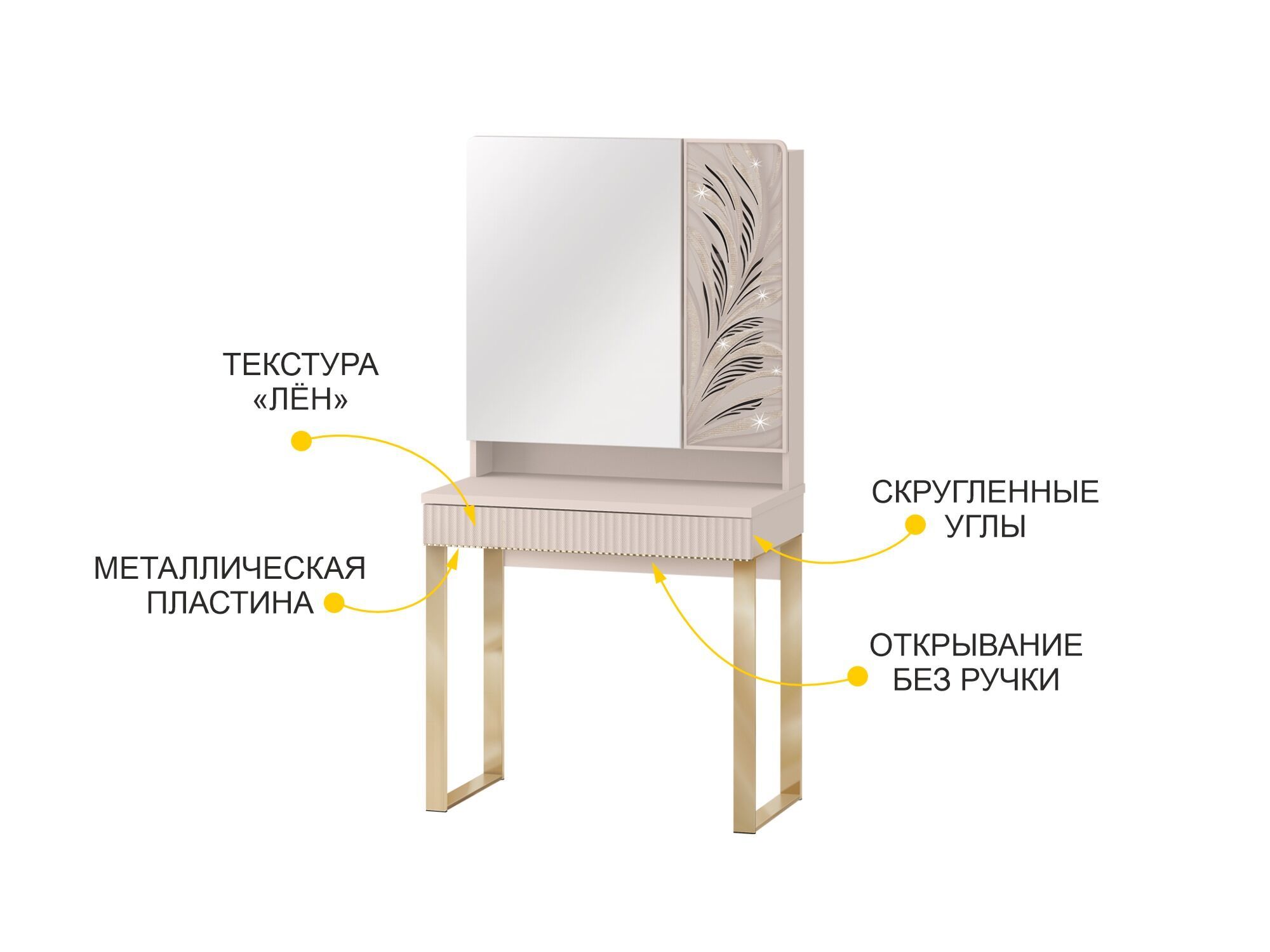 Туалетный столик «Флоренция 904.30» является частью модульной программы «Флоренция». Спальня «Флоренция» – это образец изящности и современной роскоши. Нежный цвет «Кашемир» создает светлую и теплую основу в интерьере, которая наполняет пространство спокойствием и гармонией. Оригинальные элементы в цвете «сатиновое золото» и элегантная фрезеровка подчеркивают утонченный дизайн коллекции.