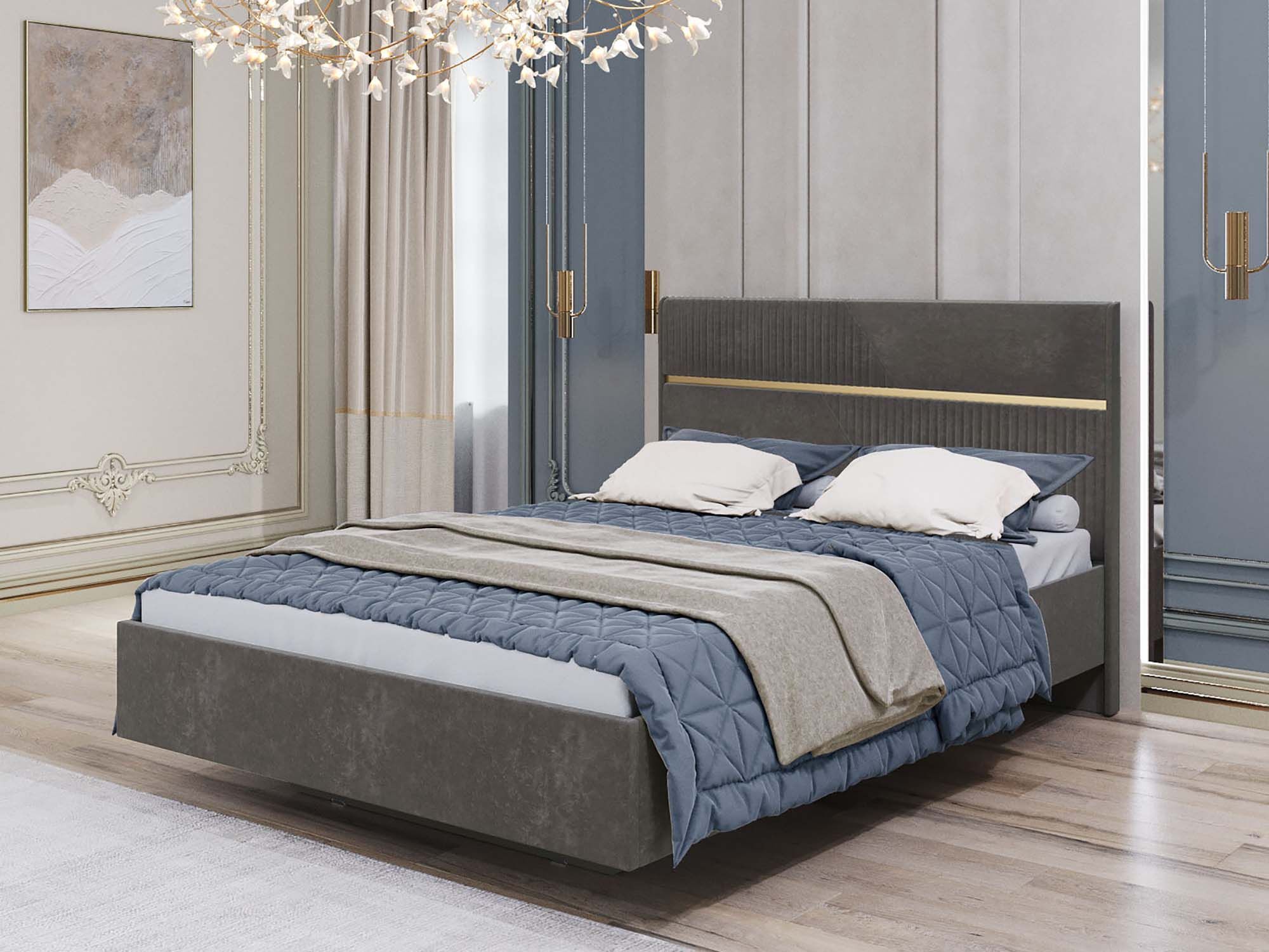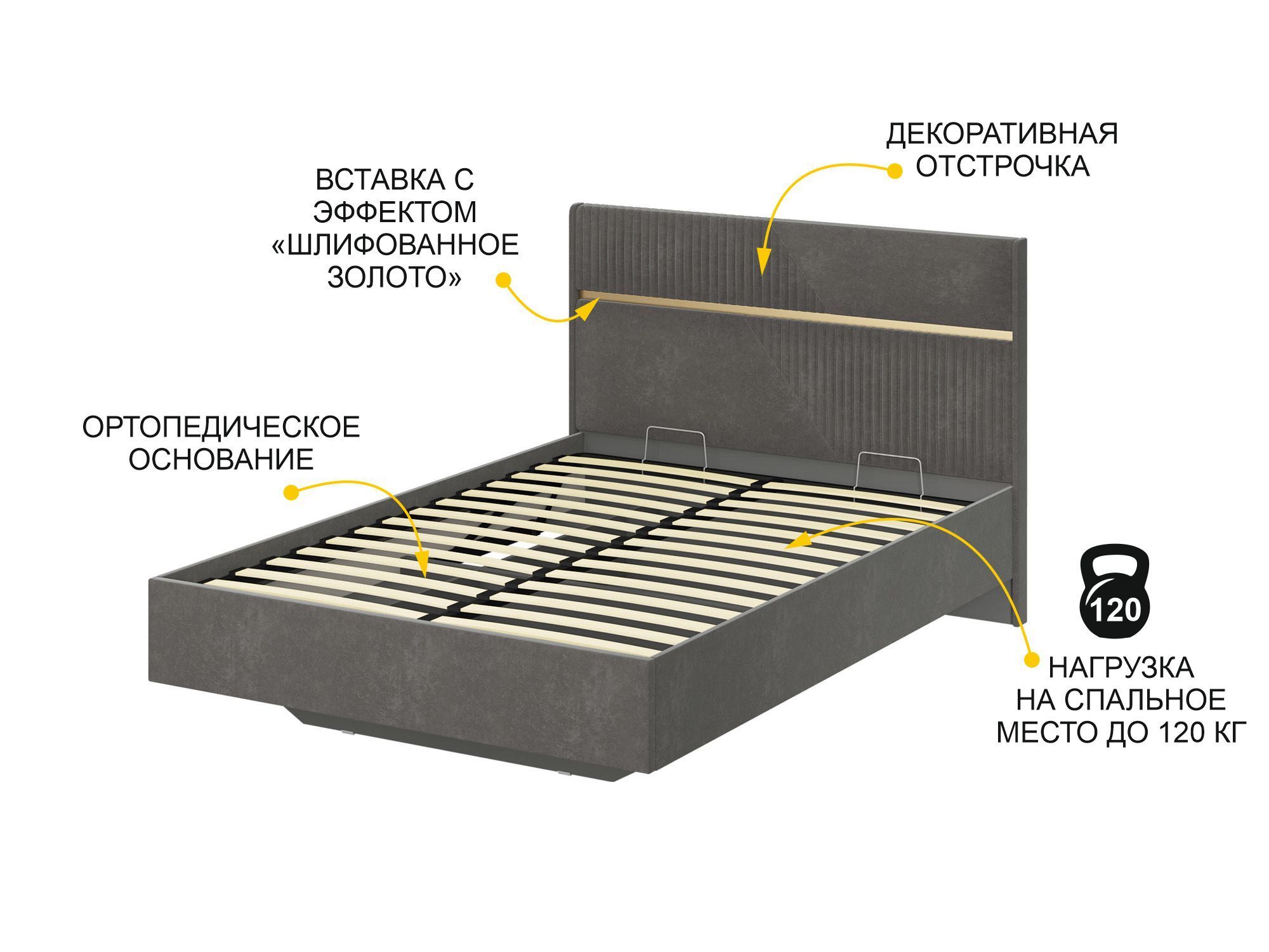 • Стильная отстрочка в сочетании с металлизированной декоративной вставкой с эффектом шлифованного золота придают кровати изысканный внешний вид.