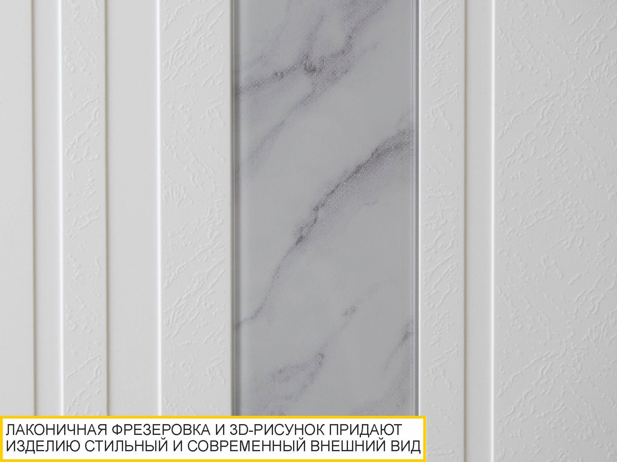 - Фасады декорированы лаконичной фрезеровкой с объемным 3D-рисунком и стеклянными вставками из прочного осветленного стекла Crystal с рисунком «мрамор».