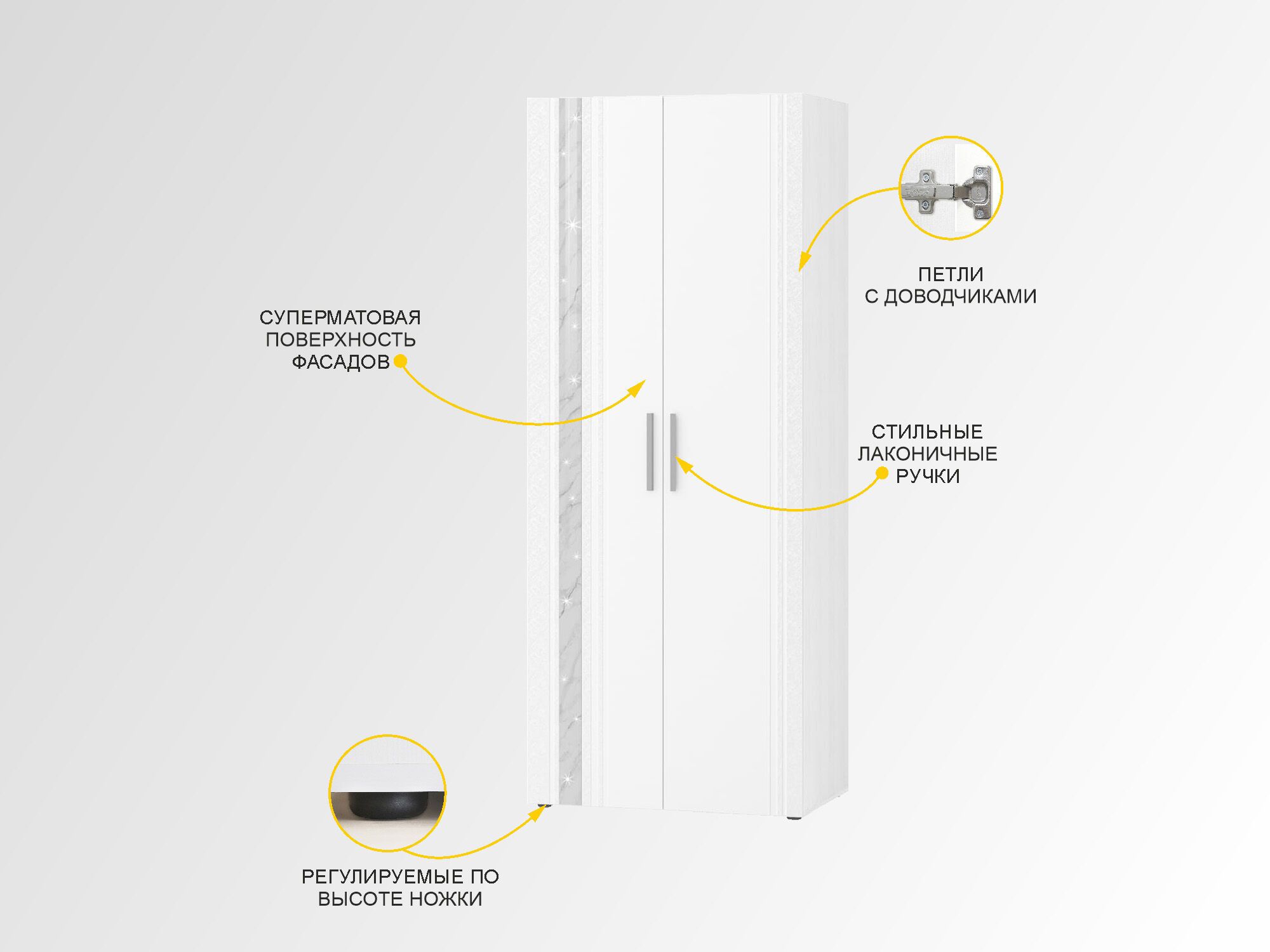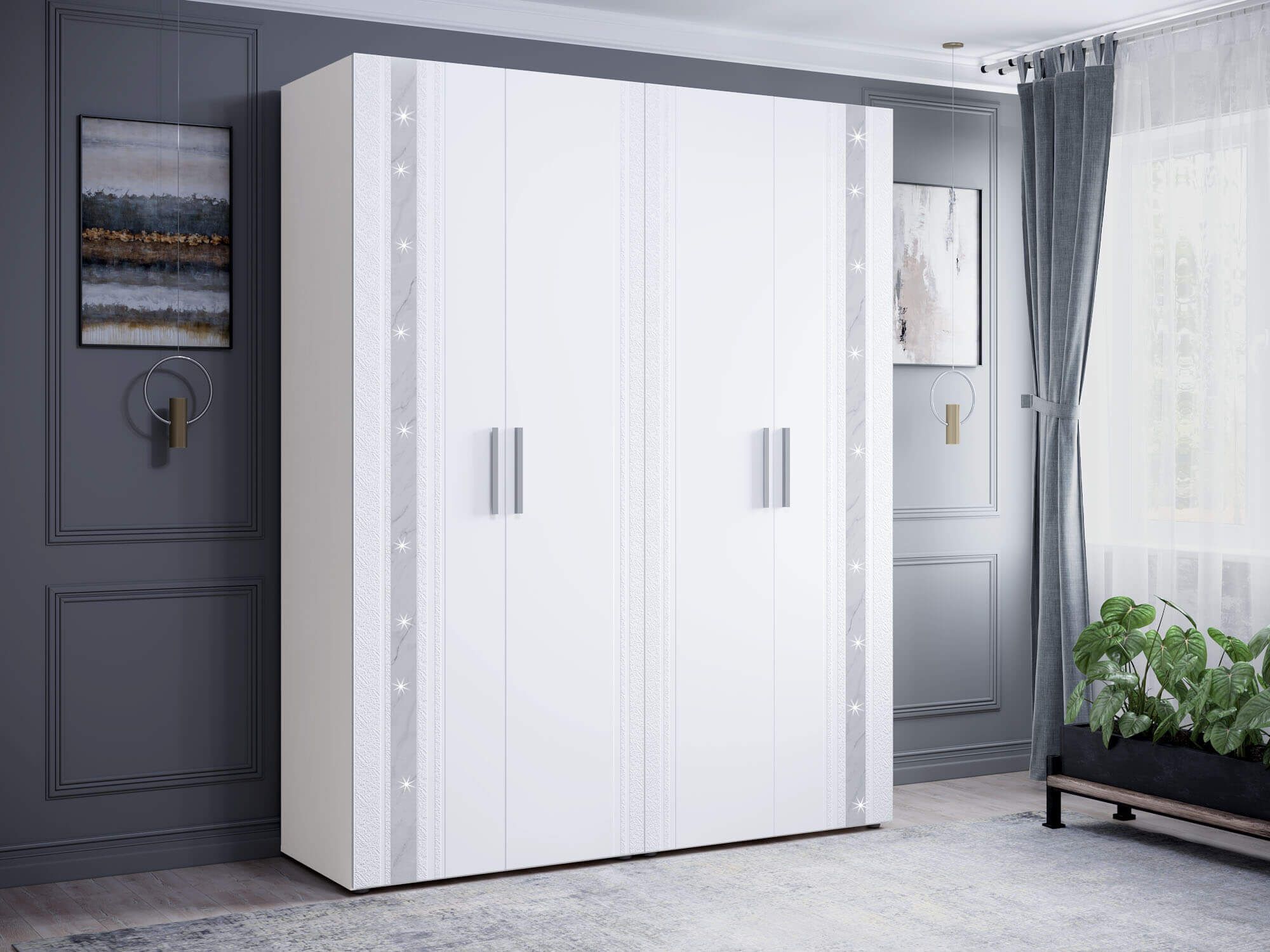Шкаф четырехдверный в комплекте «Николь 901 312» является частью модульной программы «Николь». Сочетание белоснежных матовых фасадов с нежно-серым мерцающим декором «мрамор» - визитная карточка этой коллекции. Конструктив и дизайн модели продуман до мелочей.