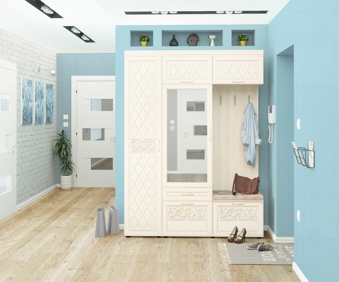 Нежная белизна фасадов и изысканность декора очаруют даже самого требовательного покупателя. Ажурная фрезеровка на фасадах дополнена глиттерным рисунком и кристаллами, что придает прихожей дополнительный шарм.