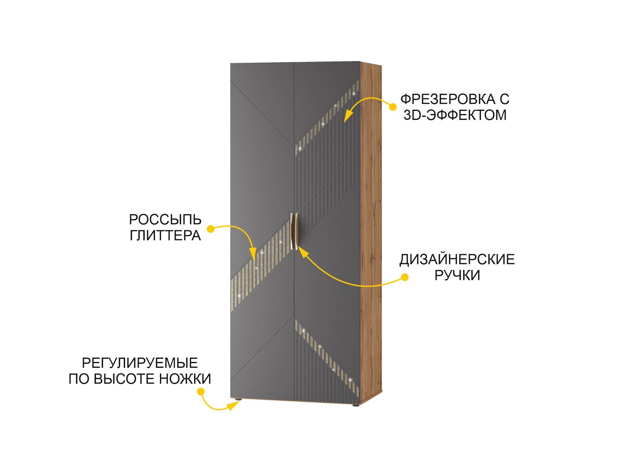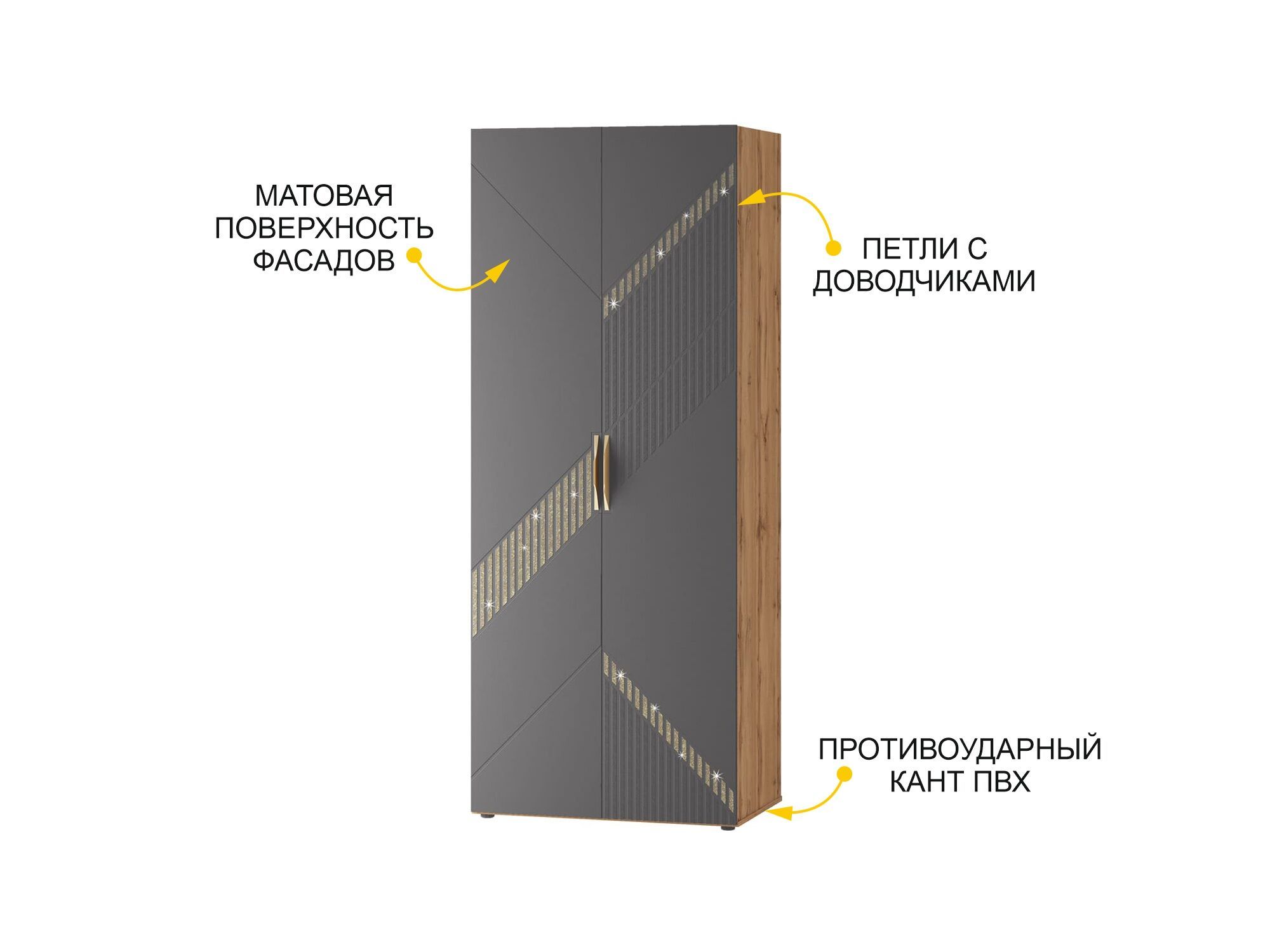 - Модуль отличается практичностью, функциональностью, а также универсальностью сборки. На свое усмотрение Вы можете поменять дверцы местами — при этом меняется и внешний рисунок фасада. В зависимости от сборки геометрия декора приобретает разное направление и визуально преображает композицию шкафа.