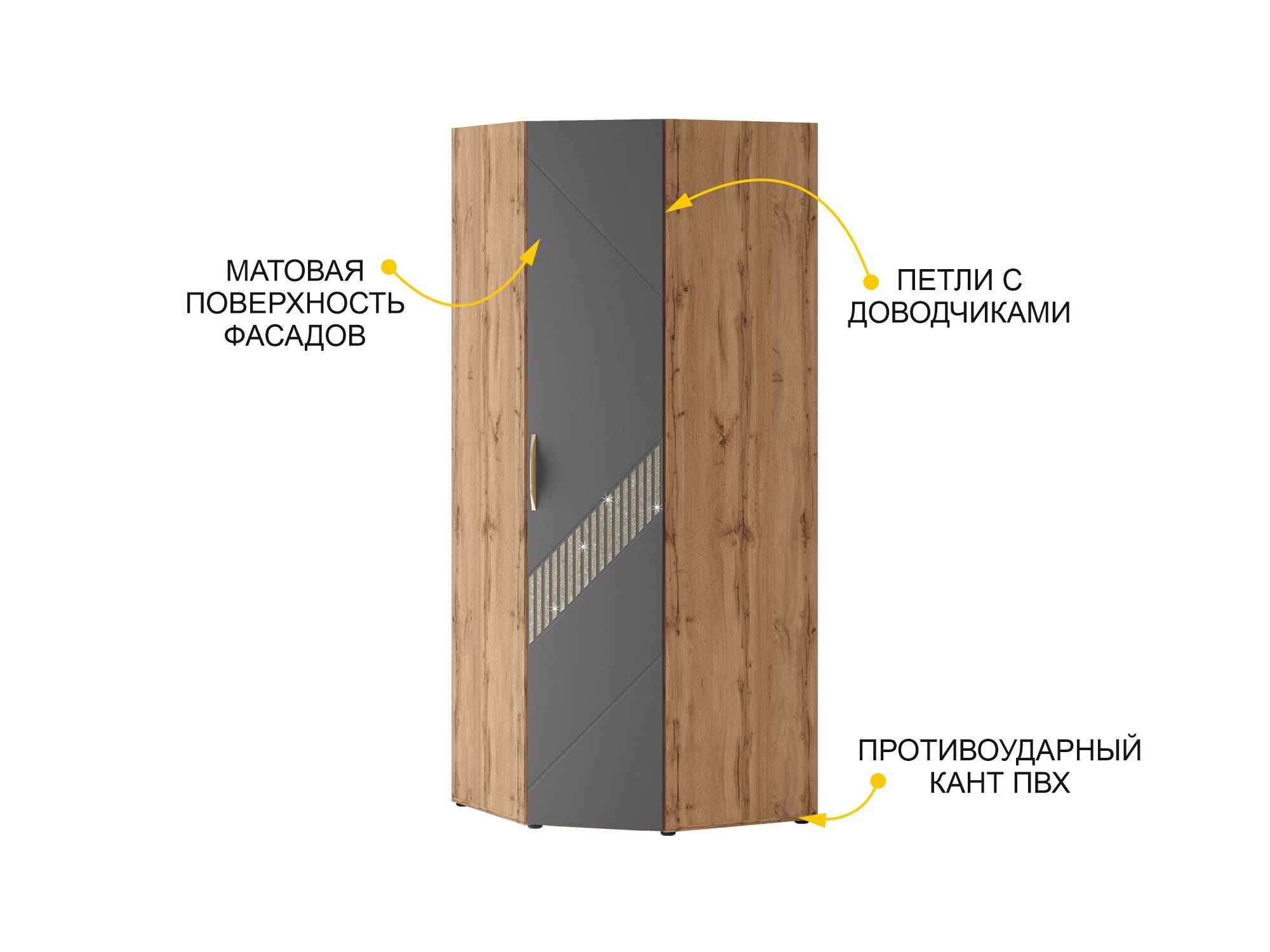 Шкаф угловой «Монако 902.08.1» является частью модульной программы «Монако 902». Коллекция «Монако 902» - это образец элегантного стиля и утонченного вкуса. Сочетание матовой графитовой поверхности фасадов с благородной древесной текстурой создает особую атмосферу гармонии и комфорта. Рекомендация наших дизайнеров: если хотите сэкономить пространство в комнате, используйте для хранения одежды угловые шкафы.