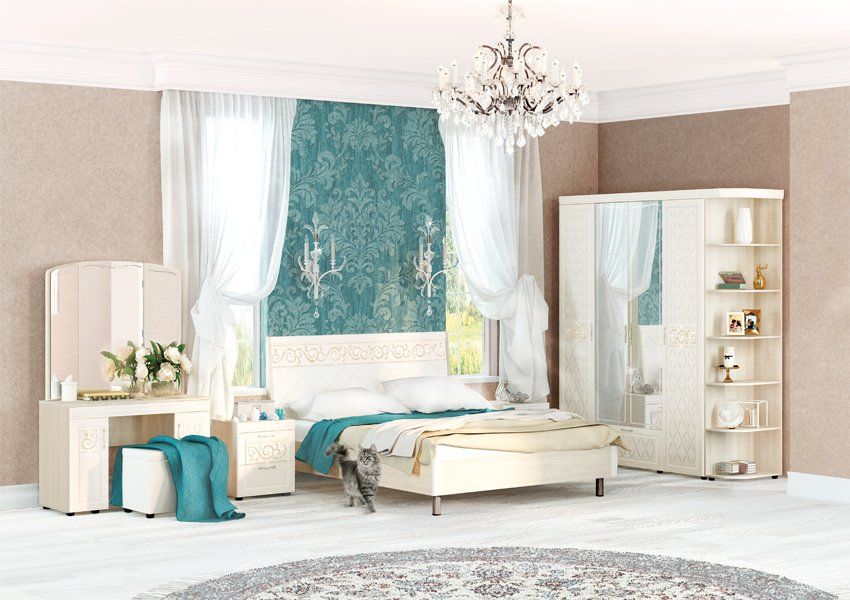 Нежная белизна фасадов и изысканность декора очаровывает с первого взгляда. Ажурная фрезеровка на фасадах дополнена глиттерным рисунком и кристаллами премиум-класса, что придаст Вашей спальне дополнительный шарм.