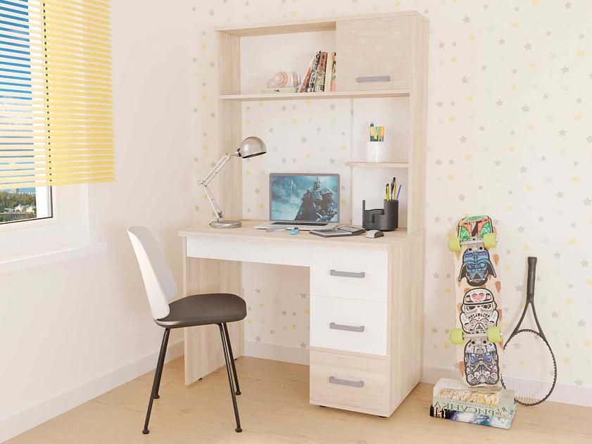 Просторная поверхность стола позволит удобно разместить как компьютерное оборудование, так и канцелярские принадлежности. В столе установлены три выдвижных ящика, а один ящик размещен под столешницей.Стол можно приобрести с надстройкой или без нее.